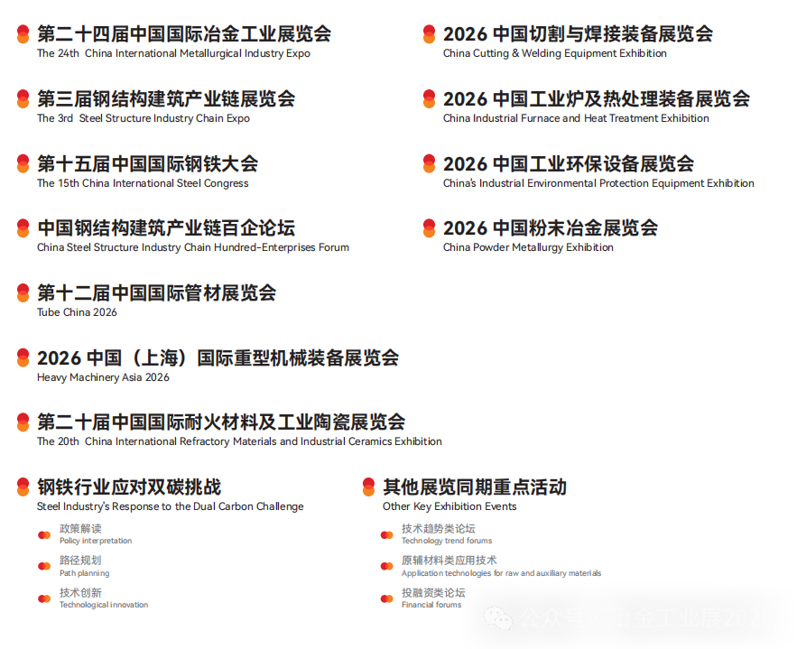 2026年,冶金展新增加粉末冶金、工业环保、切割与焊接、工业炉及热处理4大主题板块,深度融入冶金产业链全景,为参展企业打造全方位的价值平台。